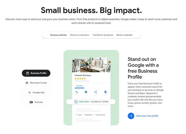Mini-site-ul „Small Business Essentials” al Google include o prezentare generală a diverselor instrumente de afaceri oferite de companie, cum ar fi profilele de afaceri Google, instrumentele pentru comercianți din Merchant Center, anunțurile Google și YouTube, și altele. De asemenea, sunt disponibile linkuri către instrumente de AI și date, precum și sfaturi pentru utilizarea optimă a acestora.